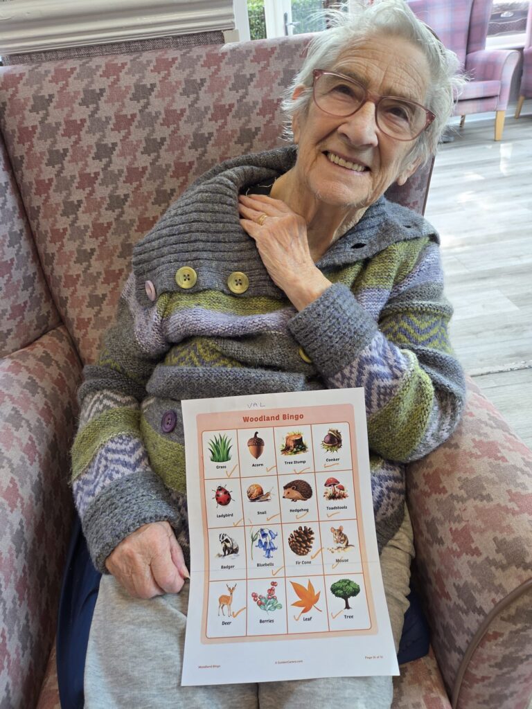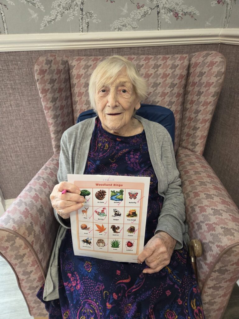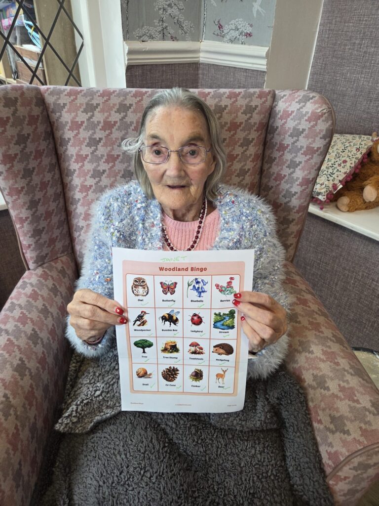 Everyone had fun spotting woodland creatures and nature-themed images like owls, hedgehogs, toadstools, and tree stumps. One of our stars, Janet, proudly showed off her completed bingo card โ what a brilliant job she did! ๐๐